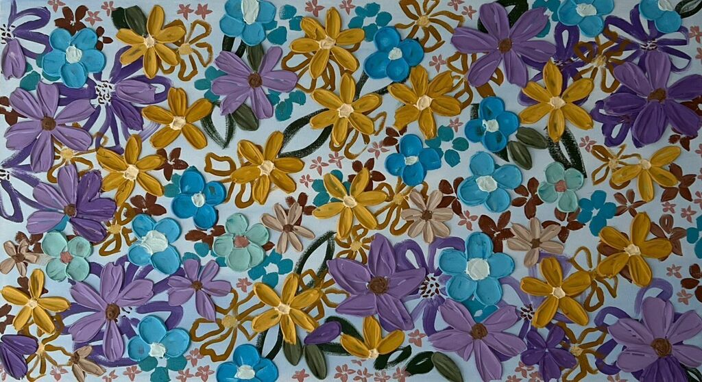 Neste quadro, a harmonia entre tons azuis e roxos cria uma atmosfera onde as flores desabrocham em um espetáculo de cores e texturas. A textura cuidadosamente aplicada, acrescenta uma dimensão tátil à obra. As flores azuis e roxas são como se o próprio céu noturno estivesse refletido nesta tela, com as estrelas substituídas por flores que brilham com uma luz própria. Esta obra é um convite para explorar os mistérios e a beleza da natureza, imerso em uma sinfonia de cores que inspiram e encantam.